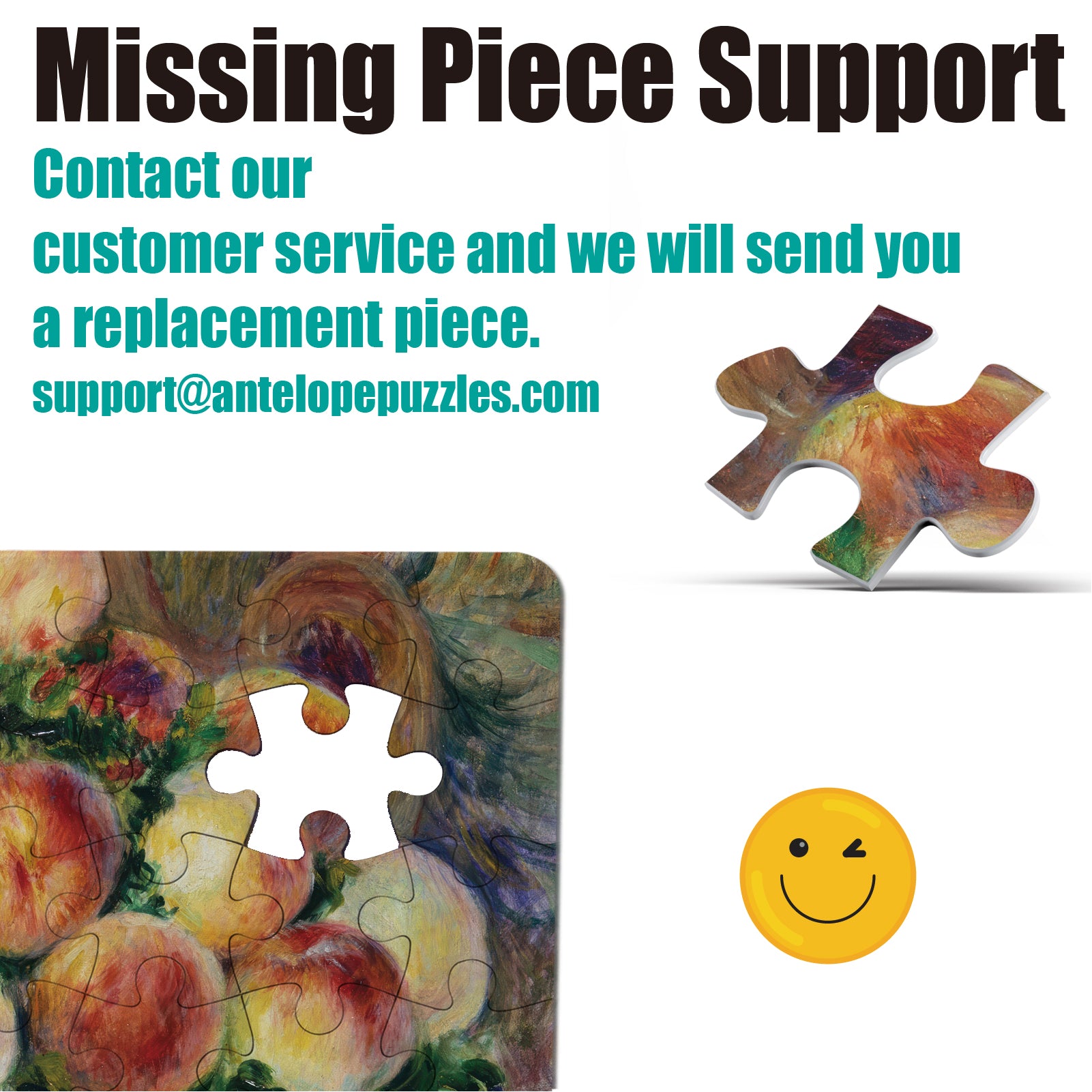 We understand how important it is to have a complete puzzle, and we apologize for any inconvenience. Rest assured, we're committed to ensuring your puzzling experience is enjoyable. If you have any additional questions or need further assistance, please don't hesitate to reach out to our customer support team. Thank you for choosing Antelope Puzzles!