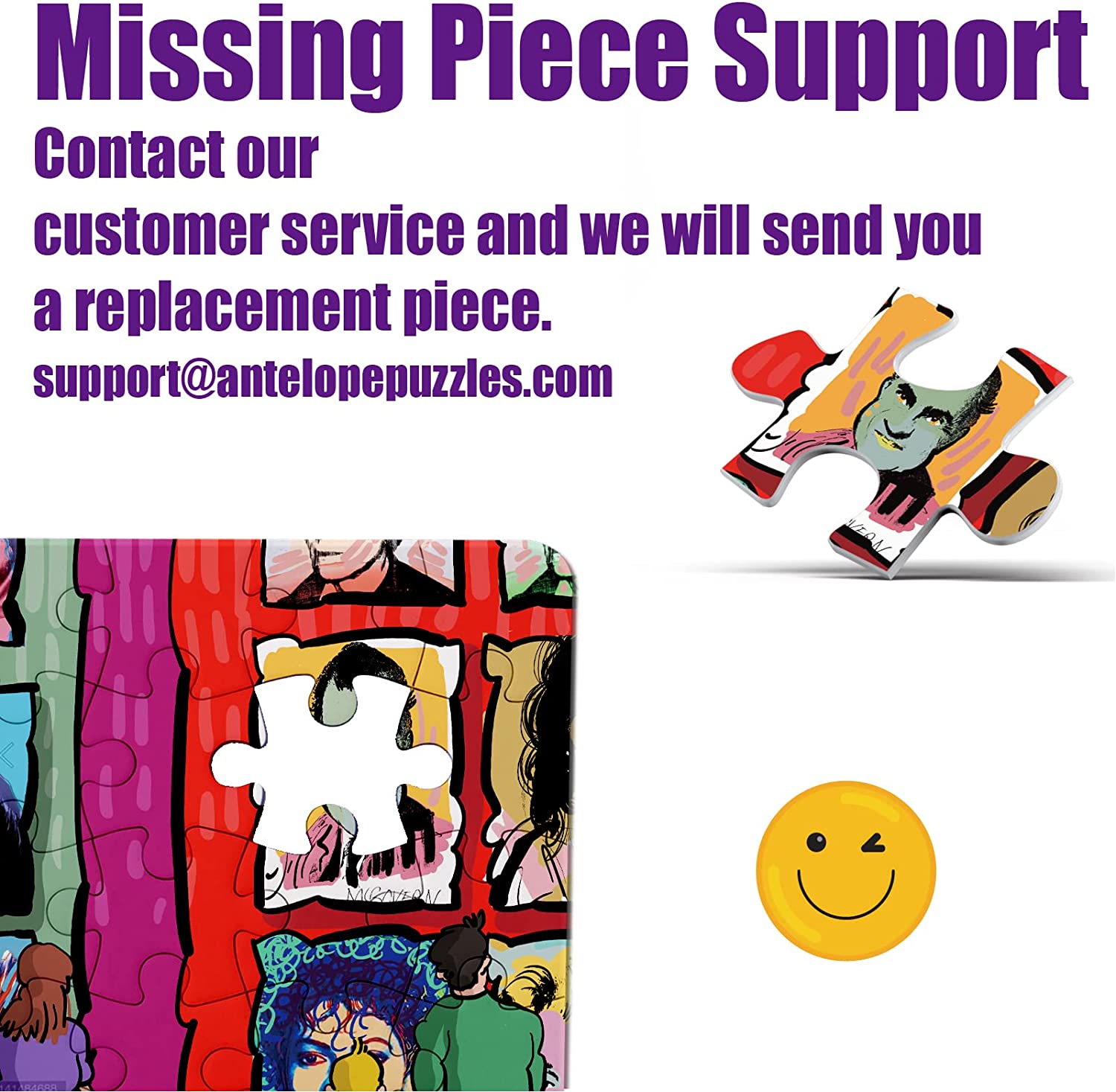 3. Email Us: Send the photograph and your order number to our dedicated Missing Piece Support team at support@antelopepuzzles.com.