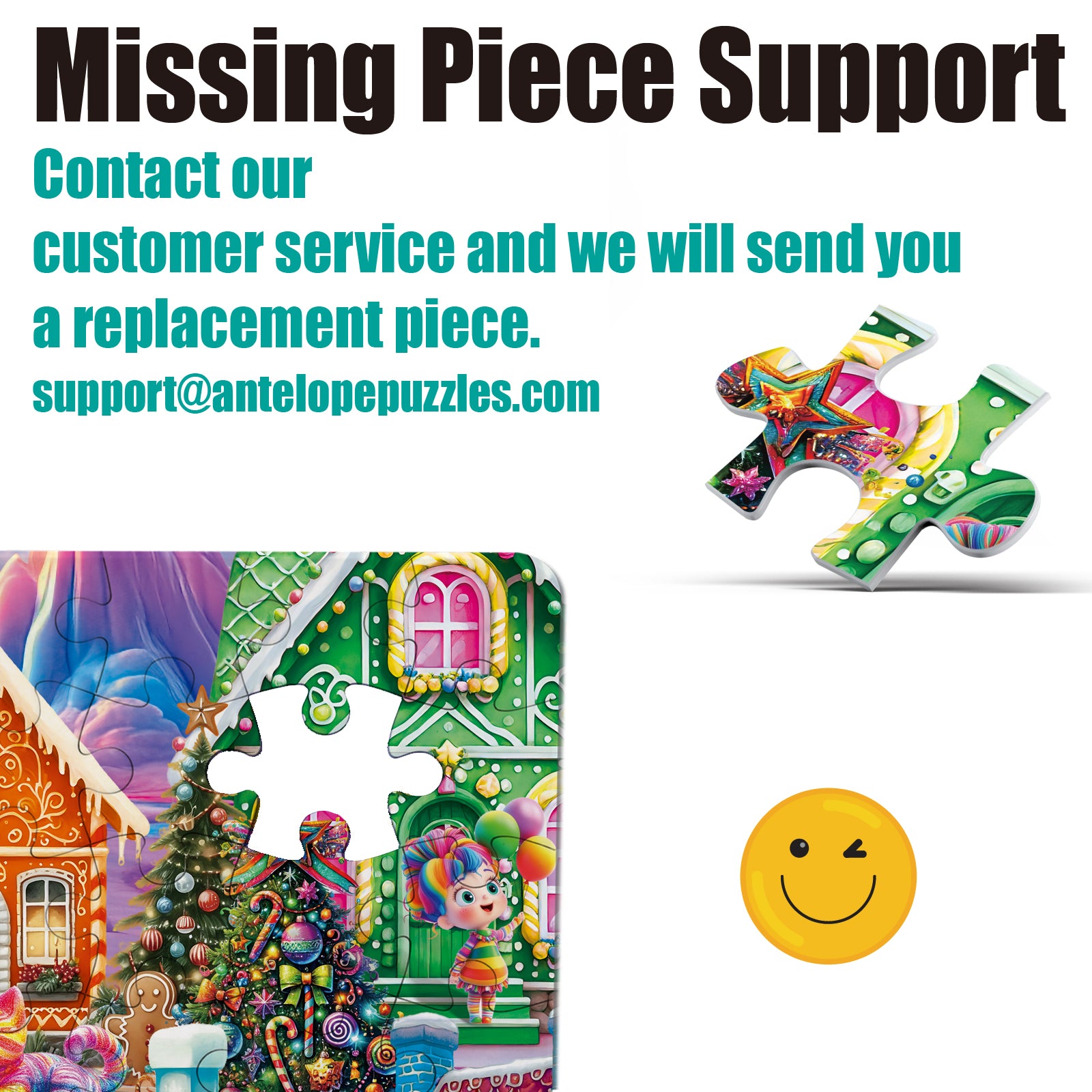 We understand how important it is to have a complete puzzle, and we apologize for any inconvenience. Rest assured, we're committed to ensuring your puzzling experience is enjoyable. If you have any additional questions or need further assistance, please don't hesitate to reach out to our customer support team. Thank you for choosing Antelope Puzzles!