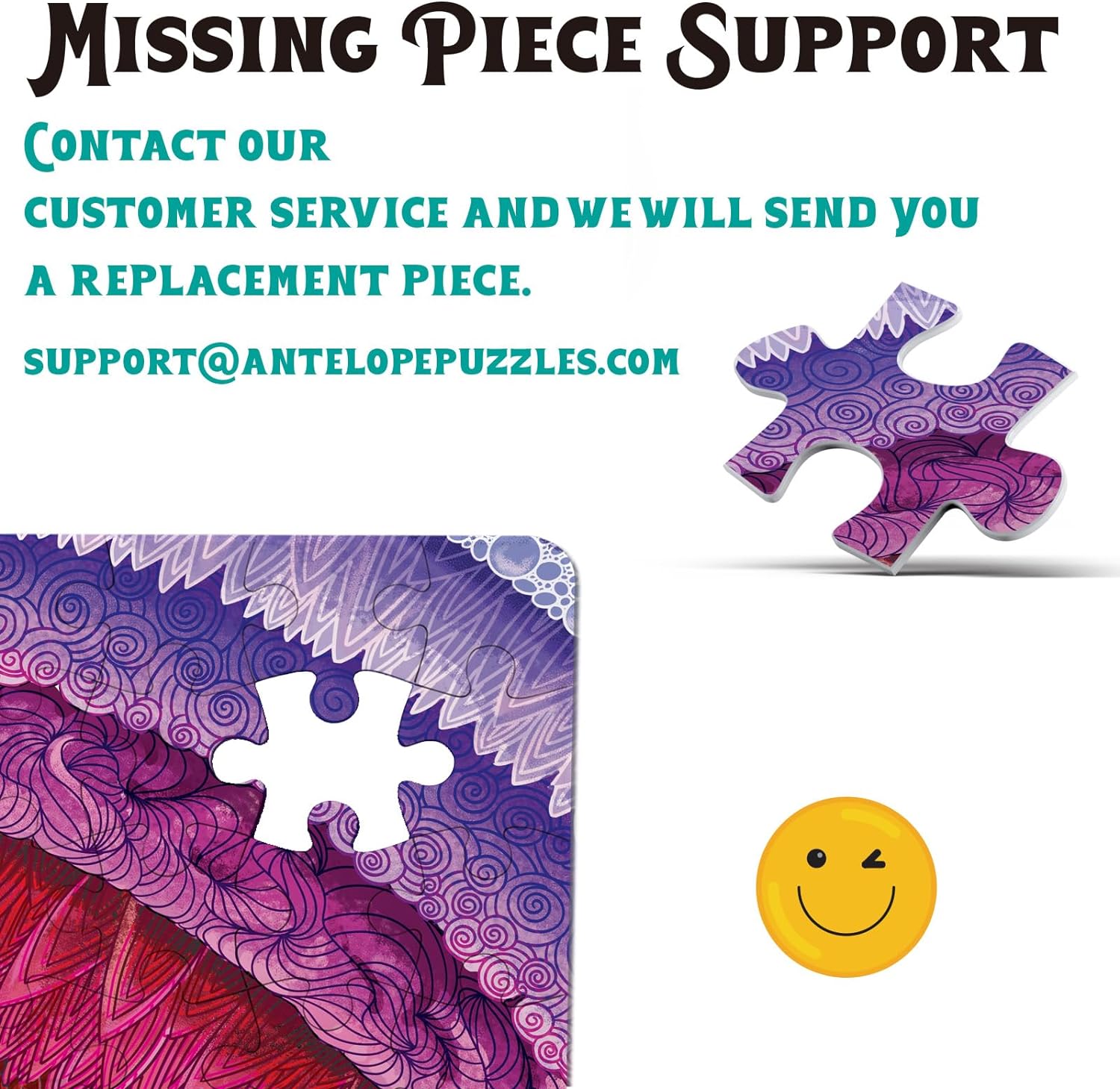 We understand how important it is to have a complete puzzle, and we apologize for any inconvenience. Rest assured, we're committed to ensuring your puzzling experience is enjoyable. If you have any additional questions or need further assistance, please don't hesitate to reach out to our customer support team. Thank you for choosing Antelope Puzzles!