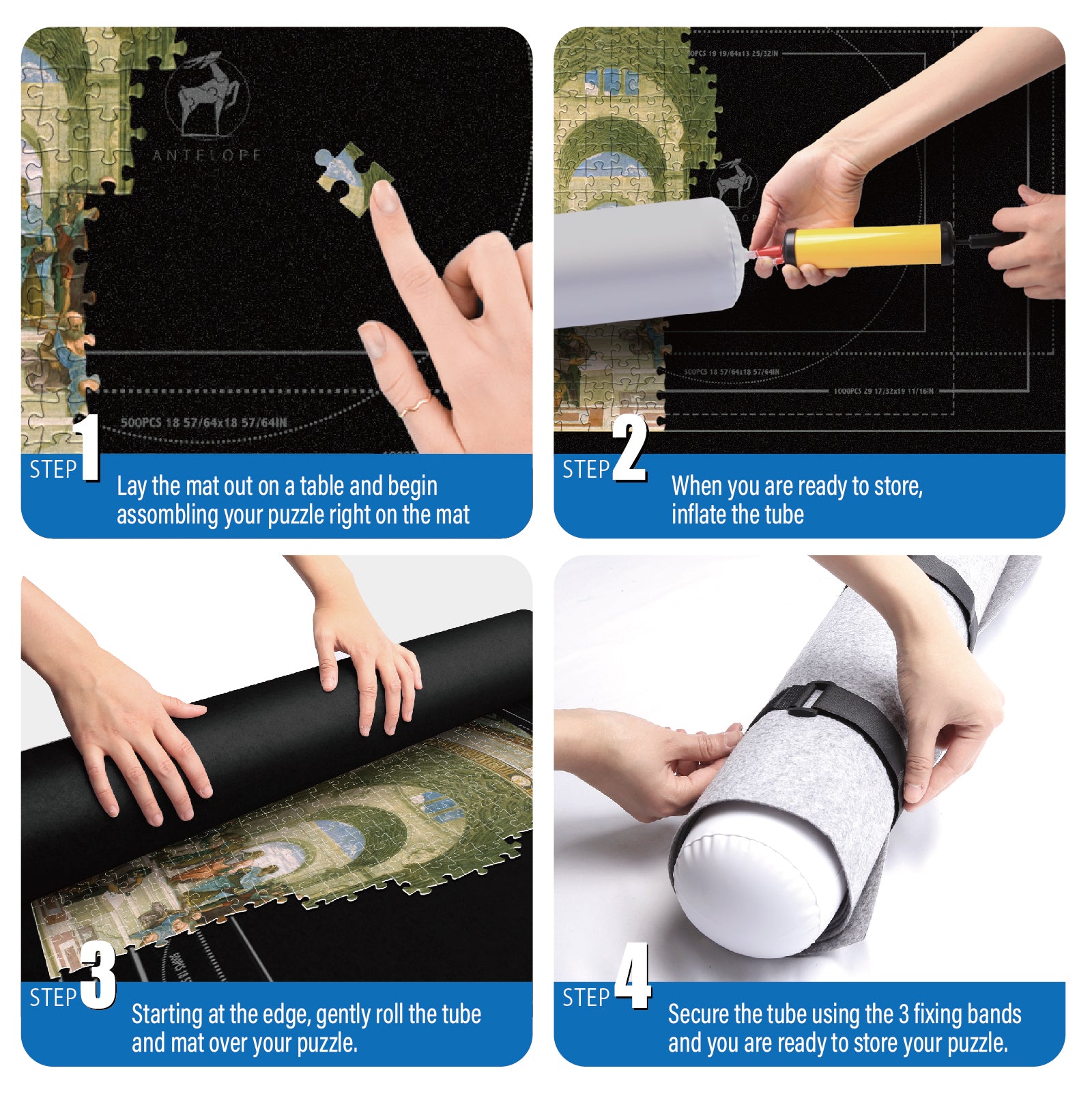 3. Before rolling up the mat, please keep the puzzles flat. Place the tube on either end of the mat and roll the mat over the tube by applying even pressure to make sure all pieces stay together.